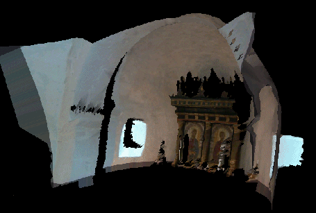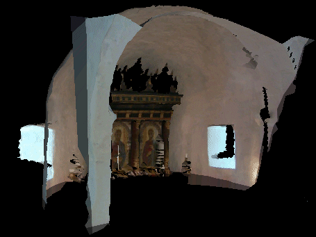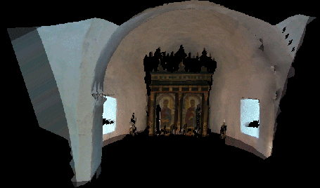 The objective of this work is to generate complete, high resolution models of real world scenes (3D geometric and texture information) from passive intensity images and active range sensors. JRC has been investigating this topic and has developed tools aiming at automatic registration based on feature correspondences between colour intensity and laser reflectance images. The correspondences computed through a rescaling and matching procedure are then used to evaluate the camera's internal and external parameters. The video image is then re-projected into the local laser coordinate frame using the computed camera parameters. The obtained image is used to evaluate the precision of the registration and can also be used directly to texture map the 3D models. The next step will be the use of the intensity information to improve the final model not only by texturing it but also by correcting and introducing new details. Here we see several views of a textured model of a part of the Bornholm church obtained by re-projecting the video image into the 3D model.