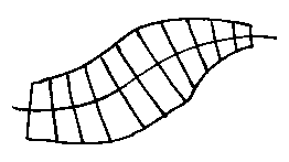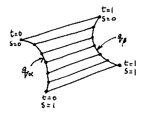 What we've effectively done is to scrape a ruler along the two curves, filling the gap between them with the surface the ruler sweeps. s says how far we've scraped the ruler, t measures along the ruler. We've created a surface like a piece of distorted graph paper; the axes are s and t, and any point in the surface is given by the three-dimensional vector r, which is a function of s and t.