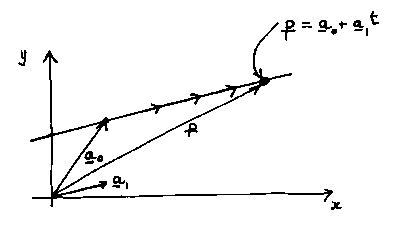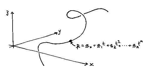 We make a parametric polynomial curve. Now p is a point in space, (x, y, z), and so the a vectors have to have three elements as well. We add terms in powers of t, and this builds a curve.