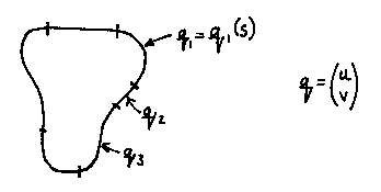 We make a two-dimensional lamina shape out of two-dimensional parametric curves, q. The parameter for these is s to avoid confusion with the spine parameter t. We obviously can't use x and y as the two dimensions for these flat lamina shapes, as the space in which the whole duct is being built is x, y, z. So we use u and v.