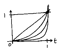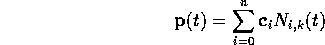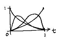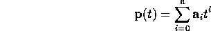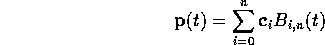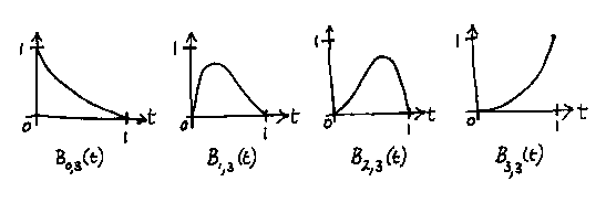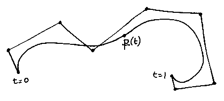 So. What we are doing is to multiply each control point by a weight (the B things that all add up to 1) and add up the results to make the point on the curve, p(t). As t goes from 0 to 1, the point p sweeps along the curve.