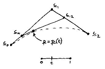This construction generalizes to any control track. We join the points that are a fraction t along each leg to the corresponding points on the next legs. This gives a track with one fewer points on then the one we started with. We then do the same to that track and so on until we get down to a single point - the point on the curve at parameter value t: