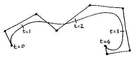After all that, it's fairly easy to loose sight of the fact that what we're doing is to apply these weights to the control points and to add up the results. Note that the weights have values of 0 for parts of the range of t along the spline. That means that the corresponding points can have no influence over the spline for those t values. This is what we wanted to achieve - the spline is now local, and we can (if we set it up right) move control points at one end without affecting the other.