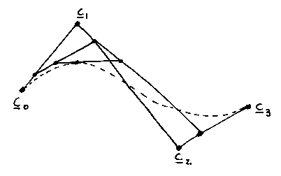...do give us some intuition as to what might happen. For example, at the start the weight for the control point labeled 0 is 1 and for all the others is 0. We would thus expect the curve to start at that point and to move away from it [in fact, doing the algebra proves that the curve is tangential to the control track at the start (and end)]. The weight on the point labeled 0 then diminishes, while the weights for the other points rise, so we would expect the curve to tend to go towards those points. Finally, the weighting functions are symmetrical, so we would expect the curve to end at point n in the same way as it started at the point labeled 0.