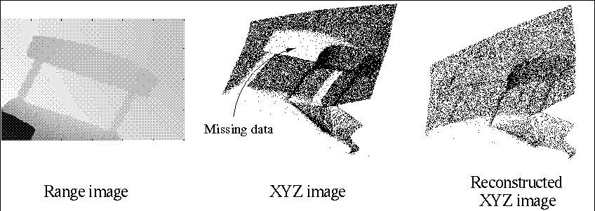 When buildings and other objects are scanned, the information needed to construct a 3D model is almost never complete. The main cause of this is occlusion: some object is blocking the view of the sensor on another object. In the left hand side of the figure we can see a range image taken in the Bornholm Church in Denmark. It is a chair in front of a wall. When we convert this image into 3D and take another perspective (centre image) we can clearly see that part of the data is missing: in the range image, part of the wall is occluded by the chair. This is clearly a problem, because a 3D model (VRML) of this image would have a chair-shaped hole in the wall, making it visually unacceptable.