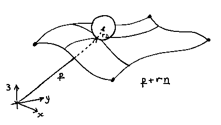 We can now make n = n'/ |n'|, which just divides n' by its own length to give n a length of 1. We can now say where the centre of the cutter should be. We take the point on the surface where we want the cutter to touch, p, and add on n multiplied by the radius of the cutter's hemisphere, r: