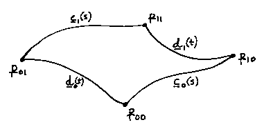 We want to fill the hole between the four curves with a sculptured surface, p(s,t). To do this, we use the following: