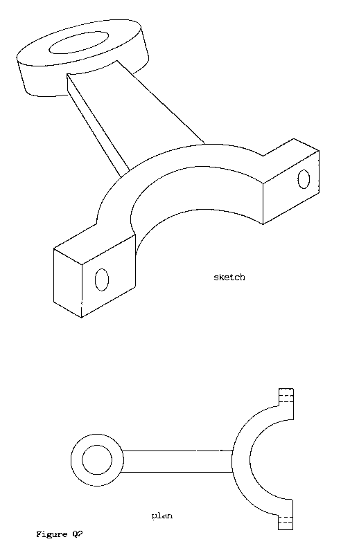 Figure Q2 shows a con-rod from an internal combustion engine. A set-theoretic modeller with (among other things) cuboids and bounded cylinders (that is, cylinders with ends) as primitives is going to be used to model the con-rod. Construct a set-theoretic expression for the con-rod, describing (with the aid of sketches, if need be) which primitives are which parts of the con-rod. (14 marks)