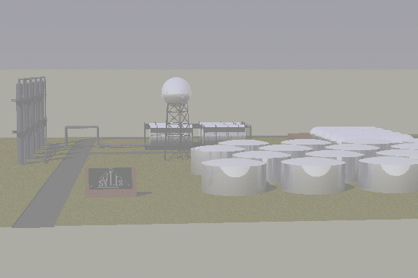 A reflected ray (3) can be generated and run to see what it hits, thus simulating mirrored surfaces. If the screen pixel is made more grey the longer the ray is before it hits something, then the scene appears to be shrouded in mist. Below is a ray-traced picture of part of an oil refinery generated by the svLis geometric modeller.
