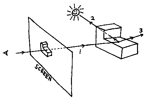 But there is no need to stop there. Once the point on the model where a ray strikes has been found another ray (2) can be run off to the source of illumination. If it hits something on the way, the original point is in shadow, if not the point is brightly illuminated. It is just as easy to deal with multiple light sources giving all sorts of fancy penumbra effects.