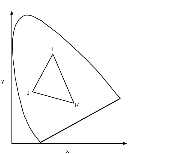 The pure colours of the spectrum lie on the curved part of the boundary, and a standard white light has colour defined to be near (but not at) the point of equal energy x = y = z = 1/3. Complementary colours, i.e. colours that add to give white, lie on the endpoints of a line through this point. As illustrated in figure 4, all the colours along any line in the chromaticity diagram may be obtained by mixing the colours on the end points of the line. Furthermore, all colours within a triangle may be formed by mixing the colours at the vertices. This property illustrates graphically the fact that all visible colours cannot be obtained by a mix of R, G and B (or any other three visible) primaries alone, since the diagram is not triangular!