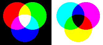 This is an additive model, i.e. the colours present in the light add to form new colours, and is appropriate for the mixing of coloured light for example. The image on the left of figure 6 shows the additive mixing of red, green and blue primaries to form the three secondary colours yellow (red + green), cyan (blue + green) and magenta (red + blue), and white ((red + green + blue).