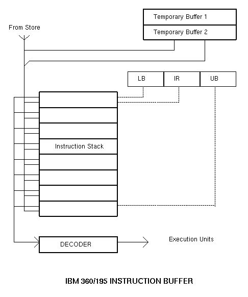 Instructions fetched from store are buffered in an eight-doubleword (64-bit) Instruction Stack (see Figure 1). The instruction fetching mechanism is controlled by three registers: the Instruction Register (IR) which addresses the instruction currently being decoded, the Upper Bound Register (UB) which points to the most recent doubleword brought into the stack, and the Lower Bound Register (LB) which points to the earliest doubleword in the stack. During normal operation the stack contains the current instruction doubleword, some doublewords ahead of the current instruction and a copy of some instructions which have already been issued.